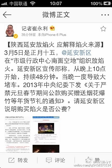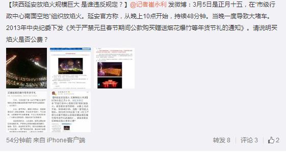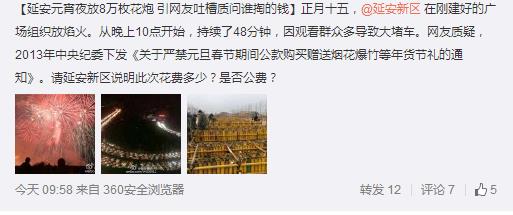 據(jù)新浪微博爆料:正月十五,延安新區(qū)在剛建好的廣場組織放焰火。從晚上10點開始,持續(xù)了48分鐘,因觀看群眾多導(dǎo)致大堵車。網(wǎng)友質(zhì)疑,2013年中央紀委下發(fā)《關(guān)于嚴禁元旦春節(jié)期間公款購買贈送煙花爆竹等年貨節(jié)禮的通知》。請延安新區(qū)說明此次花費多少?是否公費?