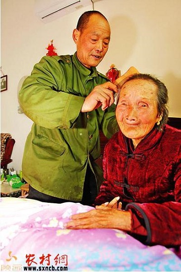姚富國(guó)正在為母親梳頭。