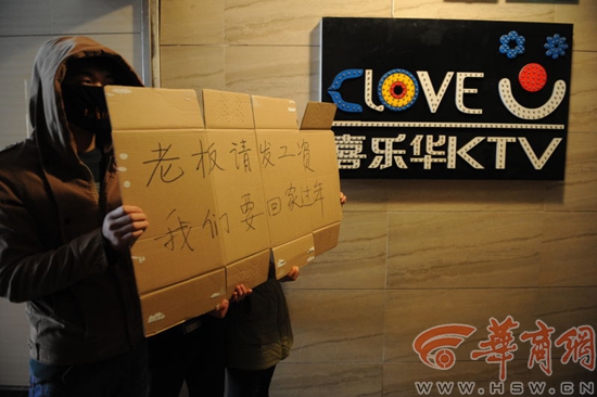 2月7日下午,在這家KTV門(mén)前,部分員工再次集結(jié)在一起,“老板請(qǐng)發(fā)工資,我們要回家過(guò)年?!奔s定15號(hào)發(fā)工資,至今一分錢(qián)也沒(méi)拿到家住藍(lán)田縣的余小姐告訴記者:“我在喜樂(lè)華KTV工作46天,一個(gè)月工資底薪2800,帶薪休假4天。當(dāng)時(shí)培訓(xùn)時(shí)公司與我們約定每月15日發(fā)上一個(gè)月的工資,但1月15日就沒(méi)有兌現(xiàn)。1月26日那天白天正在營(yíng)業(yè)時(shí),老板讓我們趕緊給客人結(jié)算,說(shuō)是要進(jìn)行電路檢修,然后就不在營(yíng)業(yè)了。再過(guò)了一天老板韓總就找不到人了。”