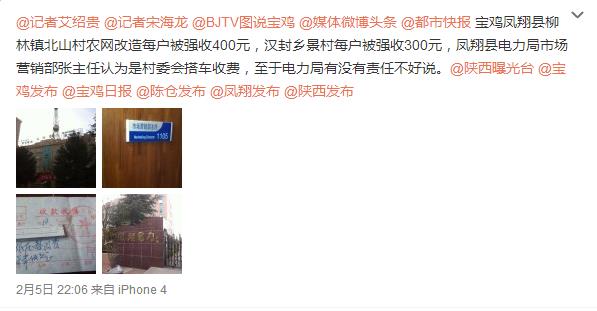 據(jù)新浪微博爆料:寶雞鳳翔縣柳林鎮(zhèn)北山村農(nóng)網(wǎng)改造每戶被強(qiáng)收400元,漢封鄉(xiāng)景村每戶被強(qiáng)收300元,鳳翔縣電力局市場(chǎng)營(yíng)銷部張主任認(rèn)為是村委會(huì)搭車收費(fèi),至于電力局有沒(méi)有責(zé)任不好說(shuō)。