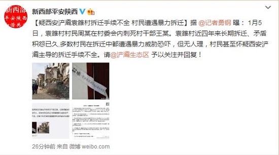 據(jù)新浪微博爆料:1月5日,西安市袁駱村村民周某在村委會(huì)內(nèi)刺死村干部王某。記者調(diào)查發(fā)現(xiàn),該案的背景是袁駱村近四年來長期拆遷、矛盾積怨已久。多數(shù)村民在拆遷中都遭遇暴力威脅恐嚇,但無人理。村民甚至懷疑西安滻灞主導(dǎo)的拆遷手續(xù)不全。記者1月9日曾給滻灞宣傳機(jī)構(gòu)電郵采訪提綱,但至今未有回音。綠色滻灞,太不禮貌!