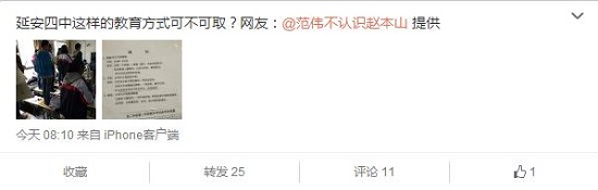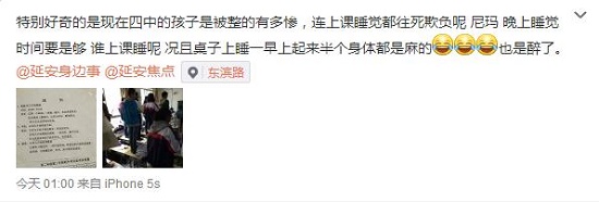 據(jù)新浪微博爆料:延安四中這樣的教育方式可不可?。刻貏e好奇的是現(xiàn)在四中的孩子是被整的有多慘,連上課睡覺都往死欺負(fù)呢,晚上睡覺時間要是夠誰上課睡呢,況且桌子上睡一早上起來半個身體都是麻的[笑cry][笑cry][笑cry]也是醉了。
