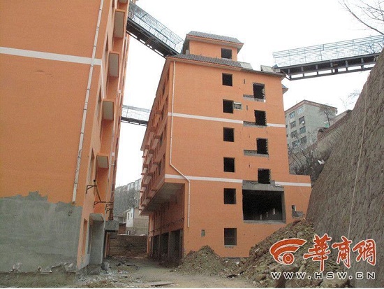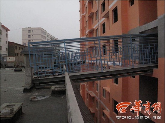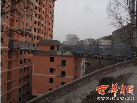 2014年9月,小雨(化名)購買了位于宜君縣玉華路上的由西安東輝房地產(chǎn)開發(fā)有限公司開發(fā)的東輝紫薇花苑商品住宅樓,原本去年年底交房,因未完工推遲到了今年5月交房。據(jù)小雨介紹,她家買的是小區(qū)1號樓的商品房,該樓2個單元,共17層。近日,小雨發(fā)現(xiàn)這棟樓的8樓外墻墻體突然被打開,一座“天橋”橫插入樓內(nèi),而“天橋”另外一頭則搭在了旁邊的6層樓樓頂上。小雨家購買的是1單元的房子,在2單元8樓與6層樓之間也有同樣的一段“天橋”,第三斷“天橋”則搭在6層樓樓頂與宜君縣宜陽北街之間。粗略算來,“天橋”距地面約20余米。