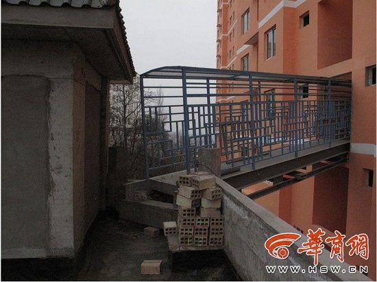 “天橋”一頭架設(shè)在一棟高層住宅樓的8層上,另一頭架設(shè)在旁邊一棟6層樓樓頂