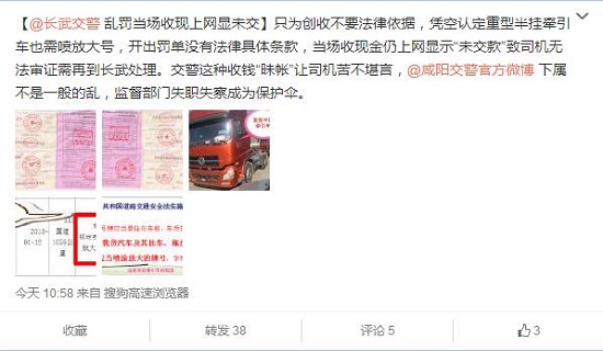 據(jù)新浪微博爆料:只為創(chuàng)收不要法律依據(jù),憑空認(rèn)定重型半掛牽引車也需噴放大號(hào),開出罰單沒有法律具體條款,當(dāng)場(chǎng)收現(xiàn)金仍上網(wǎng)顯示“未交款”致司機(jī)無(wú)法審證需再到長(zhǎng)武處理。交警這種收錢“昧帳”讓司機(jī)苦不堪言,咸陽(yáng)交警下屬不是一般的亂,監(jiān)督部門失職失察成為保護(hù)傘。