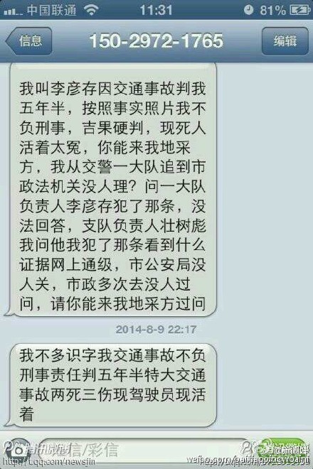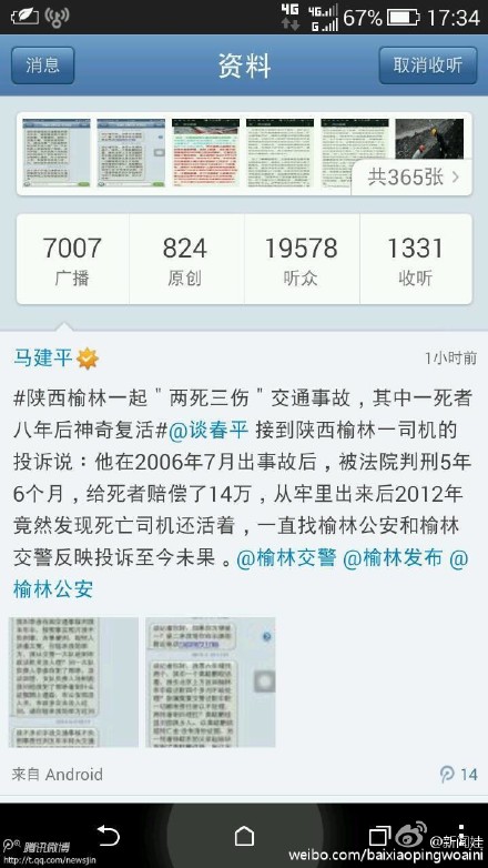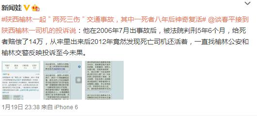 據(jù)新浪微博爆料:#陜西榆林一起"兩死三傷"交通事故,其中一死者八年后神奇復(fù)活# @談春平 接到陜西榆林一司機的投訴說:他在2006年7月出事故后,被法院判刑5年6個月,給死者賠償了14萬,從牢里出來后2012年竟然發(fā)現(xiàn)死亡司機還活著,一直找榆林公安和榆林交警反映投訴至今未果。