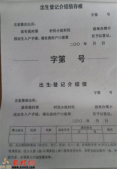 圖為史家寨派出所下發(fā)的出生登記介紹信