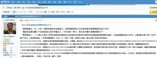 我舉報陜西省人大代表史財安套取國家資金2千多萬國家資金都去哪了?還沒落到人民手中就完了,辛辛苦苦一輩子,到頭來只剩下滿地的雪花了!陜西省第十一、十二屆人大代表,商洛市洛南縣景村鎮(zhèn)社區(qū)主任史財安在洛南縣永豐鎮(zhèn)李村洛洪路邊建設(shè)陜西財安食品廠,以此套取國家資金2千多萬,占地面積大到190畝,年生產(chǎn)豬100萬頭,可是直到目前,廠區(qū)爛尾樓排成行,空無一人,沒有一頭豬,雜草比人還高,那么大的廠區(qū)如今成為空房。史財安在景村鎮(zhèn)利用移民搬遷在第一工程期,本應(yīng)在2013年10月交房而到現(xiàn)在一直沒有把房交到農(nóng)民手中,在二期中本應(yīng)在景村街社區(qū)二組的土地開發(fā)卻把自己的私有財產(chǎn)開發(fā)移民搬遷二期工程,想騙取國家扶貧金。史財安辦的殺豬廠長期把污水排放河中,使河水臭氣熏天使人民無法氣活,直接變成了污河。每次上面檢查,他都會提前知道,以至于他平時臟亂不堪的豬場蒙混過關(guān)。在史財安當(dāng)景村鎮(zhèn)支書以來把弟弟擔(dān)任副支書妹妹擔(dān)任計生干部各組的組長自己任命,十幾年來一直是根本沒有通過村民選舉,想任命誰就是誰,一手遮天,社區(qū)公章,財務(wù)一手攬。我兒子周建鋒在史財安公司死了111天,史財安作為省人大代表一直在逃避責(zé)任,完全脫離了黨的領(lǐng)導(dǎo),忘記了人大代表的義務(wù),那么問題來了,史財安是如何當(dāng)上省人大代表的?敬請好心人、媒體、記者實地調(diào)查,給人民老百姓伸張正義。