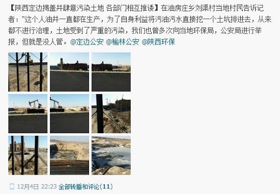 據(jù)騰訊微博爆料:【陜西定邊揭蓋井肆意污染土地 各部門相互推諉】在油房莊鄉(xiāng)劉渠村當?shù)卮迕窀嬖V記者:“這個人油井一直都在生產(chǎn),為了自身利益將污油污水直接挖一個土坑排進去,從來都不進行治理,土地受到了嚴重的污染,我們也曾多次向當?shù)丨h(huán)保局,公安局進行舉報,但就是沒人管。