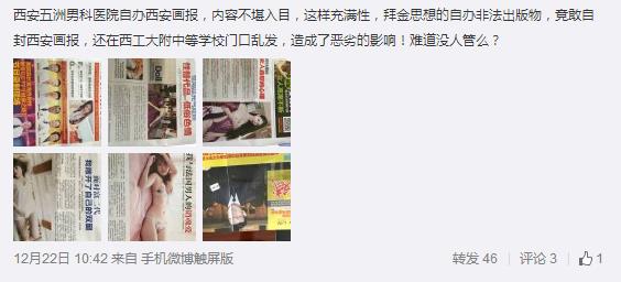 據(jù)新浪微博爆料:西安五洲男科醫(yī)院自辦西安畫報(bào),內(nèi)容不堪入目,這樣充滿性,拜金思想的自辦非法出版物,竟敢自封西安畫報(bào),還在西工大附中等學(xué)校門口亂發(fā),造成了惡劣的影響!難道沒人管么?