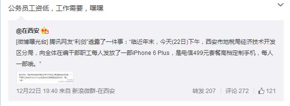 據(jù)新浪微博爆料:騰訊網(wǎng)友“利劍”透露了一件事:“臨近年末,今天(22日)下午,西安市地稅局經(jīng)濟技術(shù)開發(fā)區(qū)分局,向全體在編干部職工每人發(fā)放了一部iPhone 6 Plus,是電信499元套餐高檔定制手機,每人一部哦?!?/p>