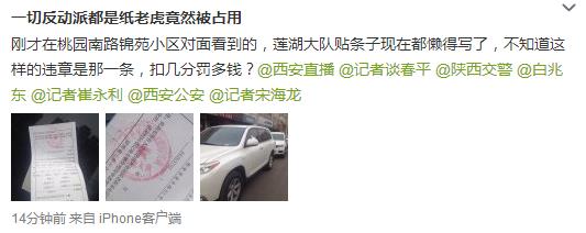 據(jù)新浪微博爆料:剛才在桃園南路錦苑小區(qū)對(duì)面看到的,蓮湖大隊(duì)貼條子現(xiàn)在都懶得寫(xiě)了,不知道這樣的違章是那一條,扣幾分罰多錢(qián)?