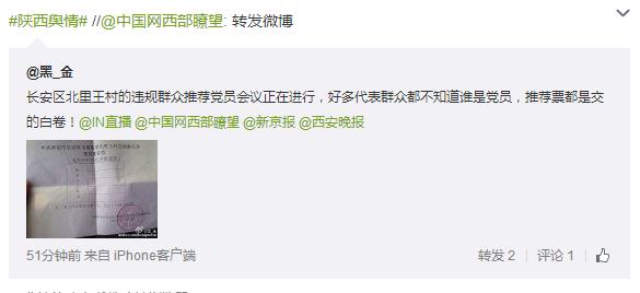 據(jù)新浪微博爆料:長(zhǎng)安區(qū)北里王村的違規(guī)群眾推薦黨員會(huì)議正在進(jìn)行,好多代表群眾都不知道誰(shuí)是黨員,推薦票都是交的白卷!