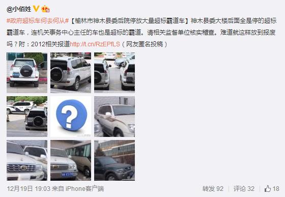 #政府超標(biāo)車何去何從#【榆林市神木縣委后院停放大量超標(biāo)霸道車】神木縣委大樓后面全是停的超標(biāo)霸道車,連機(jī)關(guān)事務(wù)中心主任的車也是超標(biāo)的霸道。請(qǐng)相關(guān)監(jiān)督單位核實(shí)稽查。難道就這樣放到報(bào)廢嗎? 附:2012相關(guān)報(bào)道http://t.cn/RzEPfLS