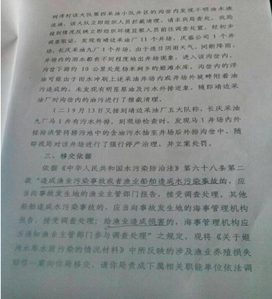 當事人多次找靖邊縣環(huán)保局相關(guān)領(lǐng)導(dǎo)得不到解決,最后寫了反映材料送到靖邊縣人民檢察院,檢察院一位王姓領(lǐng)導(dǎo)的意見也是希望靖邊縣環(huán)保局、靖邊縣水產(chǎn)中心、當事人三方協(xié)調(diào)處理賠償。從水產(chǎn)中心了解到的情況是:收到水產(chǎn)中心的一個函件,內(nèi)容“未發(fā)現(xiàn)有明顯原油及污水外排跡象……”