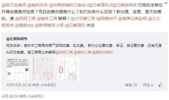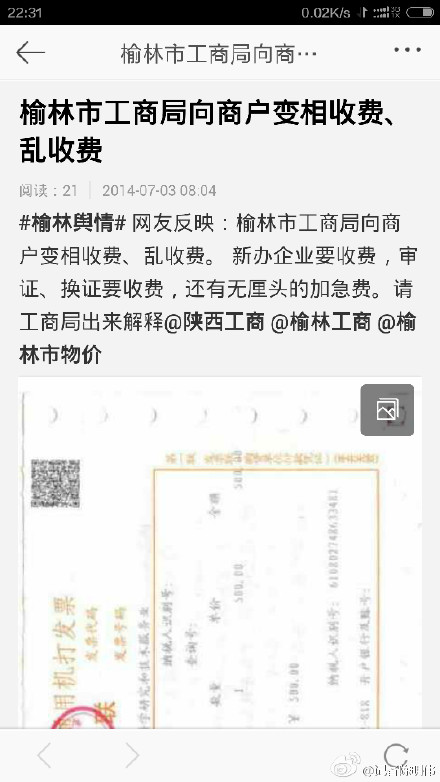 據(jù)新浪微博爆料:網(wǎng)友反映:榆林市工商局向商戶變相收費、亂收費。新辦企業(yè)要收費,審證、換證要收費,還有無厘頭的加急費。請工商局出來解釋。