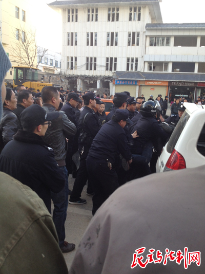 中午11點20分,當記者正在周邊了解情況時,一輛車牌為寧D0239警車上下來十余名警察將廢墟邊的商戶張文斌帶走。四名商戶里的女主人王小艷、張芳芝、張金定、柳調(diào)過無奈下跪求引來圍觀。