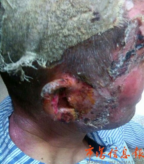 安裝工張某稱,他們5人被燒傷后,在黃龍縣醫(yī)院做了簡單治療,于11月10日凌晨兩點(diǎn)多住進(jìn)西京醫(yī)院,初期治療5個人總共花了30多萬,但在燒傷嚴(yán)重的3名患者做了二次植皮手術(shù)后,經(jīng)銷商謝某不再出錢,傷者因欠6萬元醫(yī)療費(fèi)被停止治療?!耙虻⒄`了用藥治療,我的耳朵軟骨組織已經(jīng)潰膿穿透了,醫(yī)生說要切除”。