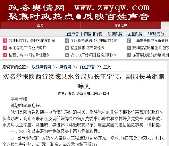 網(wǎng)民實名舉報陜西綏德縣水務(wù)局局長王寧寶 副局長馬繼鵬等人
