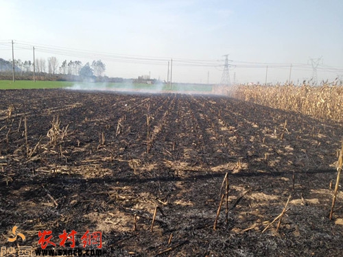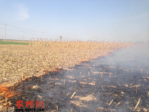 記者在現(xiàn)場看到,明火燒的正旺,一大片玉米地的秸稈已被焚燒的差不多。據(jù)附近一村民講,這大概就是上午九時開始燒的,已經(jīng)燒了兩個多小時。