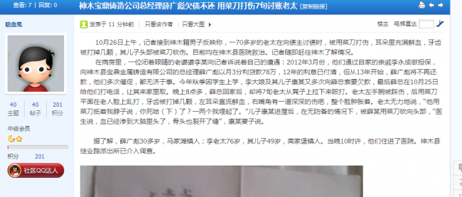 10月26日上午,記者接到神木籍男子反映稱,一70多歲的老太在向債主討債時,被用菜刀打傷,耳朵里充滿鮮血,牙齒被打掉幾顆,其兒子頭部被菜刀砍傷。目前均在神木縣醫(yī)院救治。記者隨即趕往神木了解情況。