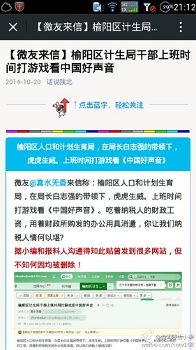 網(wǎng)友爆料【榆陽(yáng)區(qū)計(jì)生局干部上班時(shí)間打游戲看中國(guó)好聲音公共場(chǎng)合抽煙】《陜西榆陽(yáng)區(qū)人口和計(jì)劃生育局,在局長(zhǎng)白志強(qiáng)的帶領(lǐng)下,虎虎生威。上班時(shí)間打游戲,看《中國(guó)好聲音》。吃著納稅人的財(cái)政工資,用著財(cái)政所購(gòu)發(fā)的辦公用具消遣,你讓我們納稅人情何以堪?》一文;經(jīng)網(wǎng)友大量轉(zhuǎn)發(fā)后,某些官方網(wǎng)站已將此貼刪除,只見(jiàn)刪貼不見(jiàn)官方回復(fù);請(qǐng)官方@榆林市監(jiān)察局@榆林紀(jì)委;@榆林宣傳@榆陽(yáng)宣傳調(diào)查事情真相并回復(fù)處理結(jié)果。