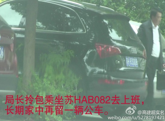 圖中文字為:局長拎包乘坐蘇HAB082去上班,長期家中再留一輛公車。