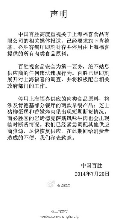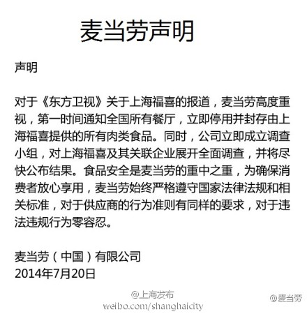 @上海發(fā)布:【麥當(dāng)勞、肯德基聲明:立即停用并封存上海福喜提供的所有肉類原料】#關(guān)注#@麥當(dāng)勞將立即停用和封存上海福喜提供的所有肉類食品,并將對相關(guān)企業(yè)全面調(diào)查,盡快公布結(jié)果。@肯德基將封存和停用相關(guān)原料,并展開調(diào)查??系禄闹ナ控i柳蛋堡、香嫩烤牛堡,必勝客的巖烤德克薩斯風(fēng)味牛肉將出現(xiàn)短期斷貨。