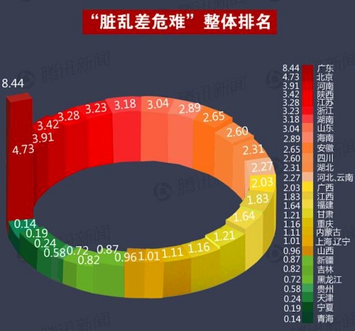 該報告按屬地原則對各個省份的總體形象危機(jī)度進(jìn)行了統(tǒng)計研究,并于5月底公布排名。廣東、北京、河南、陜西、江蘇、浙江、湖南、山東、海南、安徽位列“最危機(jī)”前十,引發(fā)廣泛關(guān)注。