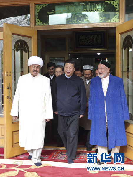 4月27日至30日,中共中央總書記、國家主席、中央軍委主席習(xí)近平在新疆考察。這是4月30日上午,習(xí)近平在烏魯木齊洋行清真寺向該寺伊瑪目穆合特?zé)崮尽ぶx日甫江、理事長白克力·亞克甫了解有關(guān)情況。新華社記者 蘭紅光 攝