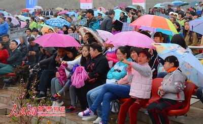 人民網(wǎng)蘭州4月20日電(高翔 王生元 苗亮軍 王文嘉)“桃源只在‘壽山’中,煙雨朦朧十里紅”,今日的蘭州市安寧區(qū)仁壽山在一片春雨的籠罩下煙雨朦朧、一片祥和,第三十一屆中國·蘭州桃花旅游節(jié)在此開幕。從早晨8時(shí)許,來自各地的游客便冒著蒙蒙細(xì)雨登上仁壽山觀看大學(xué)生文藝匯演。