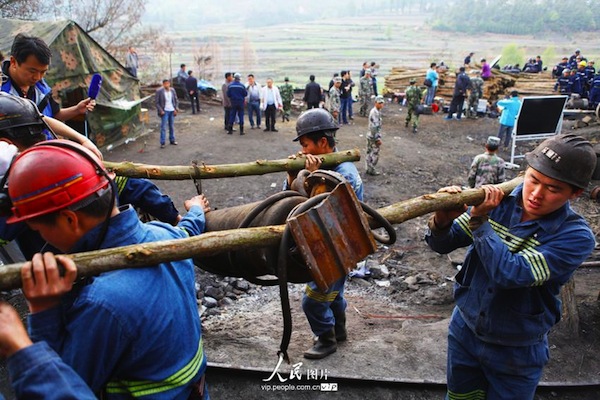 2014年4月7日,礦工守候在事故現(xiàn)場。