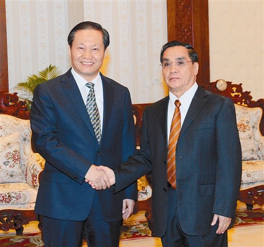 3月27日,率團訪問老撾的(廣西壯族)自治區(qū)黨委書記、自治區(qū)人大常委會主任彭清華在萬象會見了老撾總理通邢。