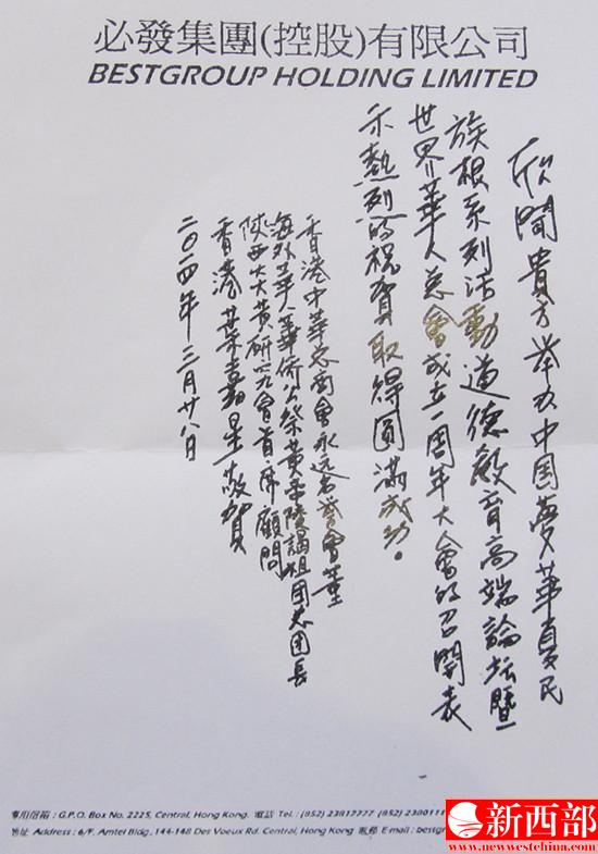 香港中華總商會(huì)永遠(yuǎn)名譽(yù)會(huì)董、海外華人華僑公祭黃帝陵謁祖團(tuán)總團(tuán)長(zhǎng)、陜西炎黃文化研究會(huì)首席顧問(wèn)、香港必發(fā)控股集團(tuán)董事局主席葉嘉星先生向大會(huì)發(fā)來(lái)賀電,賀電說(shuō),欣聞貴方舉辦“中國(guó)夢(mèng)、華夏魂、民族根”系列活動(dòng)——道德教育高端論壇暨世界華人總會(huì)成立一周年大會(huì),表示熱烈的祝賀取得圓滿成功。新西部網(wǎng)王順利攝