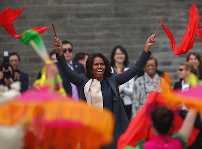 應(yīng)國(guó)家主席習(xí)近平夫人彭麗媛邀請(qǐng),美國(guó)總統(tǒng)奧巴馬夫人米歇爾·奧巴馬以及米歇爾的母親和兩個(gè)女兒昨日從北京抵達(dá)西安參觀了兵馬俑,在短短的一個(gè)多小時(shí)里,米歇爾一行領(lǐng)略2000多年前威武浩蕩的秦俑軍陣,與中國(guó)歷史文化“零距離”接觸。隨后,她們游覽了西安城墻。