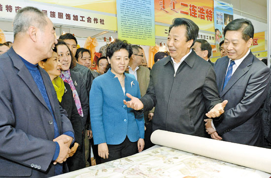 2月25日,自治區(qū)黨委書(shū)記王君參觀首屆內(nèi)蒙古文化產(chǎn)業(yè)產(chǎn)品展。記者袁永紅攝