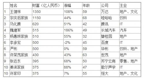 11日,胡潤研究院在北京發(fā)布2013胡潤百富榜,“地產大王”王健林以1350億財富超越宗慶后,首次成為中國首富。宗慶后家族和馬化騰分別以1150億元和620億元財富位列第二、第三位。