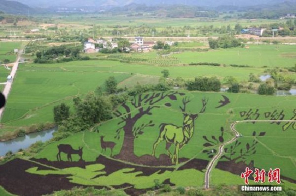 資料圖:廣西鹿寨縣通過創(chuàng)意農(nóng)業(yè)豐富傳統(tǒng)鄉(xiāng)村旅游,實現(xiàn)農(nóng)業(yè)高收益,促進農(nóng)民增加收入,圖為該縣種出的3D彩色水稻畫。林馨 攝