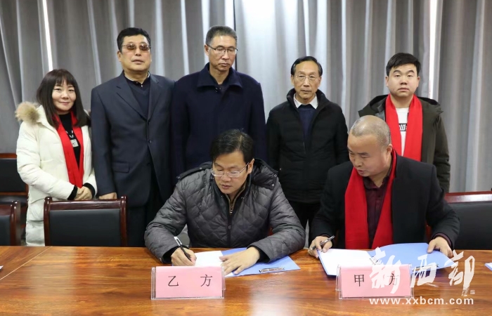 郭氏專業(yè)委員副會長郭大凱(前左)與陜西蓬騰農(nóng)產(chǎn)品有限公司總經(jīng)理郭小鵬雙方就合作建立書畫工作室舉行簽約儀式