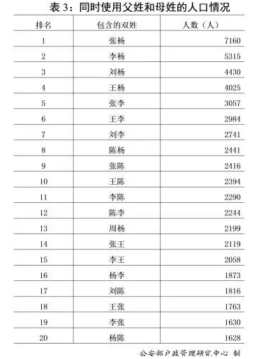 最近30年,在姓名中同時(shí)使用父姓和母姓的人數(shù)快速增長(zhǎng)。1990年底,這一數(shù)據(jù)為11.8萬(wàn)。2018年底,這一數(shù)據(jù)為110萬(wàn)。同時(shí)使用父姓和母姓時(shí),姓氏組合主要集中為常見(jiàn)的“張、王、李、楊、劉、陳、周”姓等,人數(shù)排名前20的主要有“張楊”“李楊”“劉楊”“王楊”“張李”等。