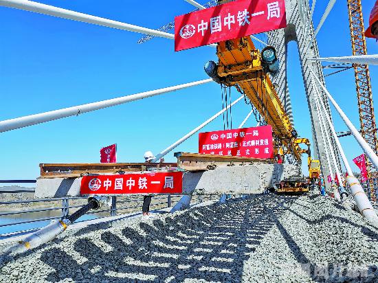2日13時,在新疆富蘊縣境內(nèi)喀臘塑克水庫1號大橋上,隨著兩架鋪軌機將兩組25米軌排推進落地,阿勒泰—富蘊—準東鐵路全線貫通,標志著北疆鐵路環(huán)線正式形成。