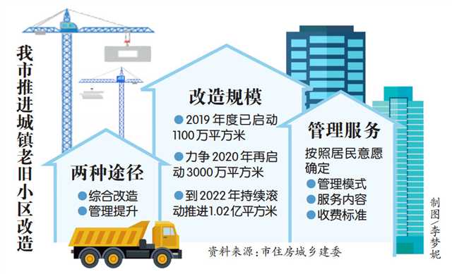 我市將在基本完成2019年度已啟動1100萬平方米改造提升任務(wù)的同時,力爭2020年再啟動3000萬平方米。到2022年,形成更加完善的長效工作機制和制度政策體系,按照“實施一批、謀劃一批、儲備一批”的原則,有計劃持續(xù)滾動推進全市1.02億平方米改造提升任務(wù)全面實施。