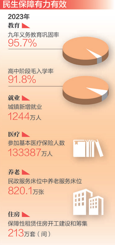 數(shù)據(jù)顯示,2023年,全國居民人均可支配收入實際增長6.1%,快于同期GDP增速;全國城鎮(zhèn)新增就業(yè)1244萬人,就業(yè)保持總體穩(wěn)定;疊加降價和醫(yī)保報銷,2023年協(xié)議期內(nèi)談判藥為患者減負超2000億元……一張張民生清單,給百姓生活帶來了看得見、摸得著的可喜變化,不斷增強人民群眾的獲得感、幸福感、安全感。