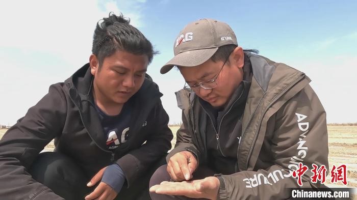 棉農(nóng)正在查看棉花的播種情況。(申凱龍 攝)
