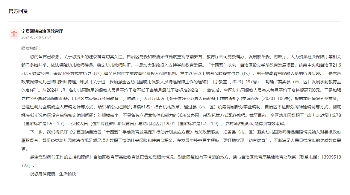 收到留言后,寧夏回族自治區(qū)教育廳作出公開回復(fù)?;貜?fù)稱,自治區(qū)黨委和政府始終高度重視學(xué)前教育,教育廳會(huì)同黨委編辦、發(fā)展改革委、財(cái)政廳、人力資源社會(huì)保障廳等相關(guān)部門多措并舉,依法保障幼兒教師待遇、穩(wěn)定幼兒教師隊(duì)伍。