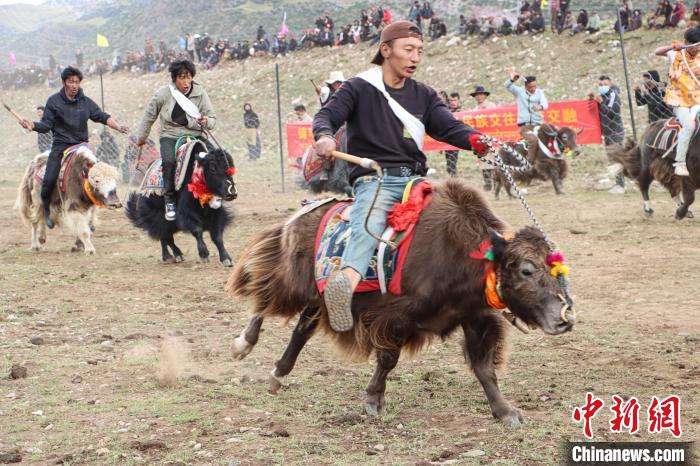 賽牦牛活動現(xiàn)場,牧民將自家的牦牛精心打扮,信心滿滿地走上起跑線,一聲令響,眾騎手驅(qū)牛疾馳?,F(xiàn)場呼聲陣陣,高潮迭起,為每一頭疾馳的牦牛加油歡呼。