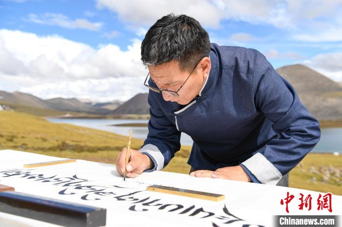 圖為書法家在思金拉措湖邊用藏文書寫“思金拉措”。 貢嘎來松攝