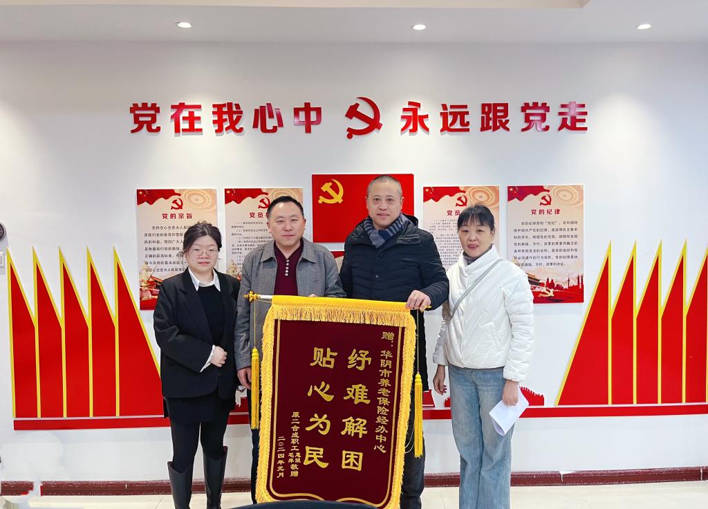 2024年1月17日,原華陰市二合成職工惠先生、毛女士將一面寫有“紓難解困 貼心為民”的錦旗送到華陰市養(yǎng)老保險(xiǎn)經(jīng)辦中心,對(duì)華陰市養(yǎng)老經(jīng)辦中心工作人員的耐心細(xì)致、專業(yè)高效的經(jīng)辦服務(wù)表示感謝。