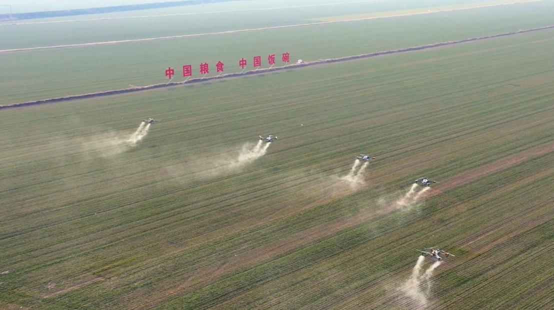 “注意,高度3米,飛行速度6米,噴幅6米5,準(zhǔn)備起飛!”伴隨著無人機(jī)指揮員趙展翅的指令,6臺大疆T60農(nóng)用無人機(jī)騰空而起,沿著麥田勻速飛行,實(shí)施化學(xué)除草、追肥等作業(yè)。