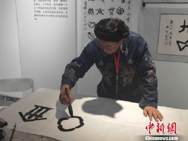 水書(shū)習(xí)俗代表性傳承人楊勝超在活動(dòng)現(xiàn)場(chǎng)揮毫,用水族先民創(chuàng)造的文字水書(shū)寫(xiě)下了“家和財(cái)旺”,引人駐足。